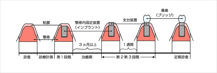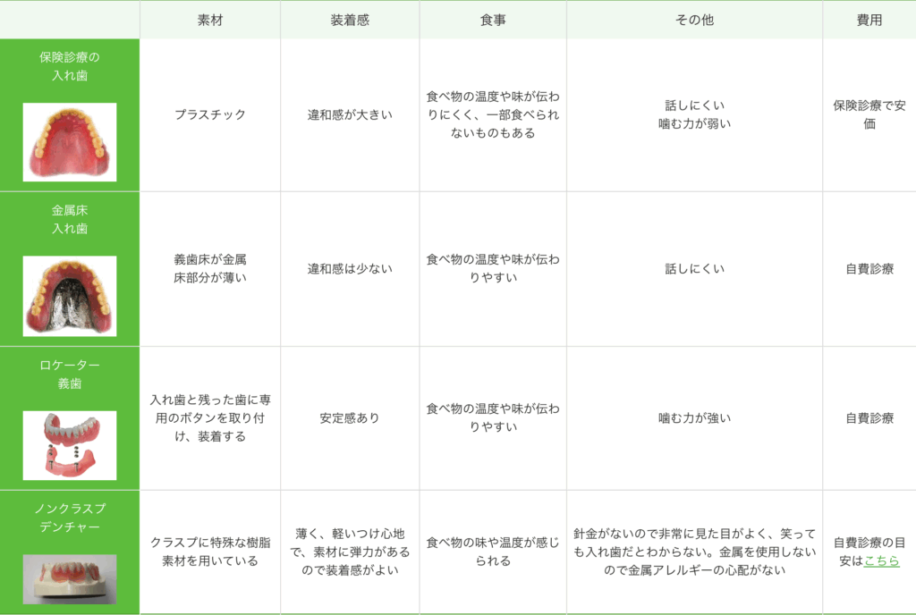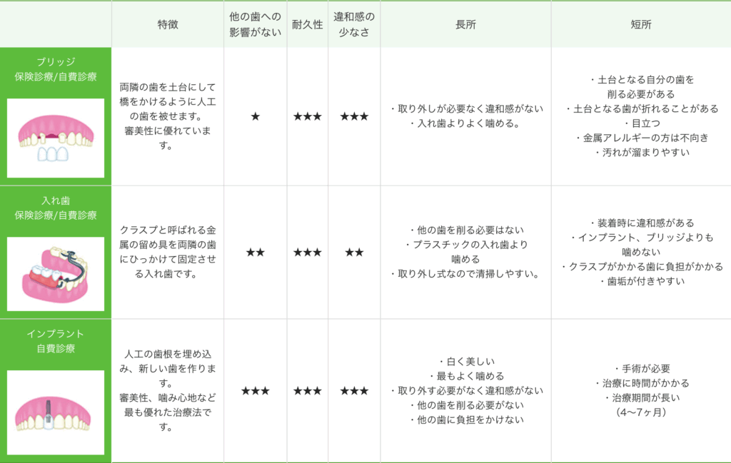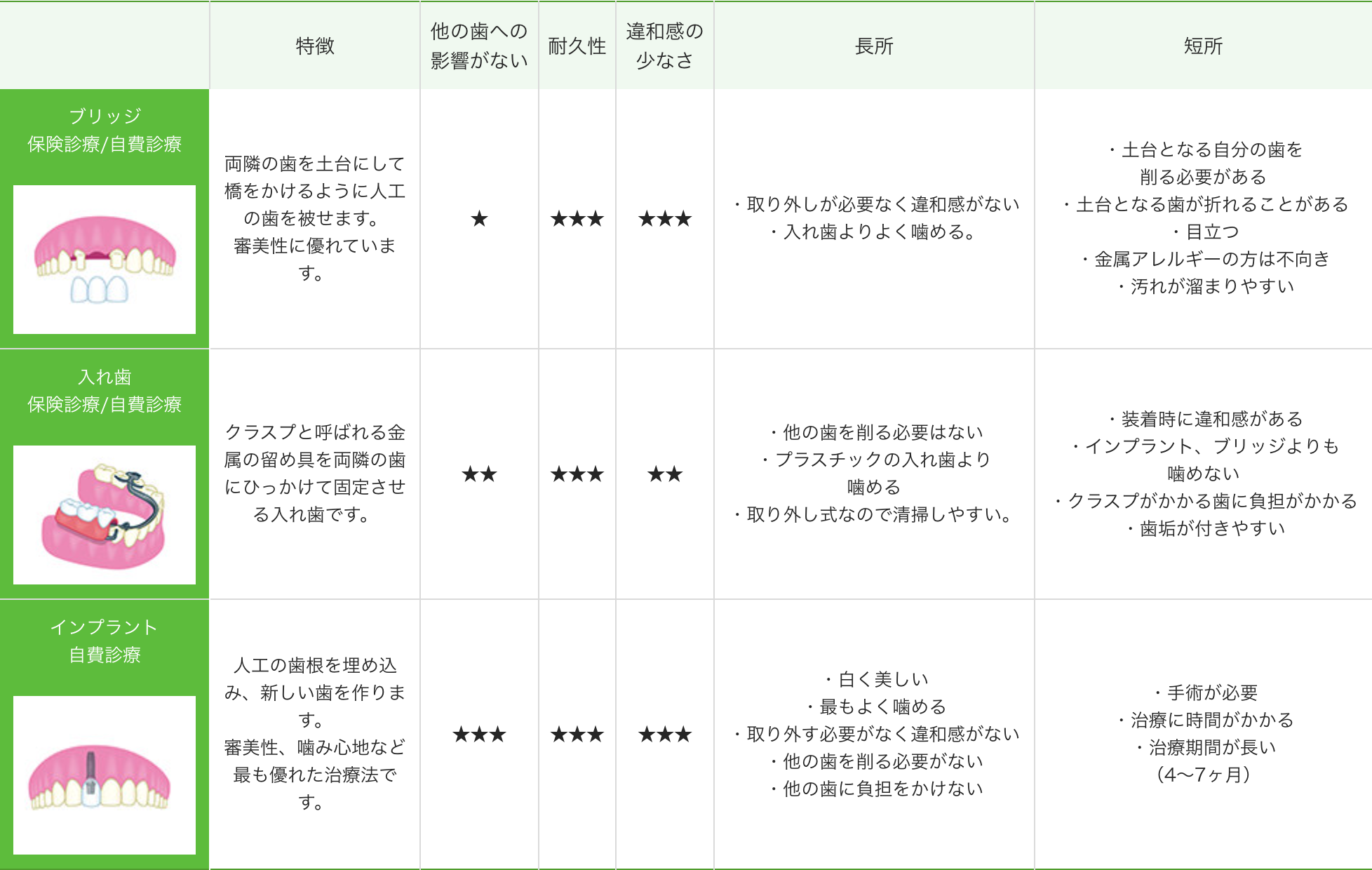 歯を失ってお困りの方へ 欠損治療(ブリッジ、入れ歯、インプラント) 削った歯や失った歯に患者さんのニーズに合った欠損治療を行っています。 虫歯治療で削った歯や、歯周病などで失った歯に対しては、次のような欠損治療を行っています。 詰め物・被せ物 ブリッジ 入れ歯 インプラント ブリッジ・入れ歯・インプラントの違い 治療法や治療期間、使用感、費用など、患者さんのニーズを十分考慮しながら、さまざまな治療を行います。 ※クリックすると拡大できます ブリッジ ブリッジとは、歯のない部分に橋をかけるように差し歯を入れる治療法です。歯の欠損が少ない場合に効果的です。 治療方法 ① 失った歯の両隣の歯を削る。 ② 歯の型を採り、ブリッジ(差し歯)をつくる。 ③ 失った歯の両隣にブリッジをかけ、装着する。 入れ歯 ブリッジとは、歯のない部分に橋をかけるように差し歯を入れる治療法です。歯の欠損が少ない場合に効果的です。 治療方法 ① 歯茎の型、噛み合わせをとり、入れ歯をつくる。 ② 入れ歯を装着する。 ③ 入れ歯による傷の処置・調整を行う。 ④ 入れ歯の吸い付きが悪くなった場合は修理する。 入れ歯の種類 治療法や治療期間、使用感、費用など、患者さんのニーズを十分考慮しながら、さまざまな治療を行います。 ※クリックすると拡大できます 入れ歯のメンテナンスは定期的に 入れ歯治療を行った後は、医院での定期的なメンテナンスが大切です。入れ歯が合わない状態だと噛み合わせに問題が出たり、周囲の歯に負担をかけることになります。当院では定期的に入れ歯の調整やブラッシング指導などを行っています。 Implant インプラント 抜けてしまった歯の骨部分に金属(チタン)の根の部分を埋め込み、人工歯をかぶせる治療法です。機能的で審美性に優れており、ブリッジや入れ歯治療で満足できないという方にもおすすめです。 治療方法 ① インプラント治療ができるか口腔内の検査を行う。 ② 外科的処置をして、骨の中に金属の根を埋め込む。 ③ 金属の根が骨と結合するまで保定期間を設ける。 ④ 外科的処置をして、根に人工歯をかぶせる。 ⑤ 施術後は定期的な通院をしていただく。